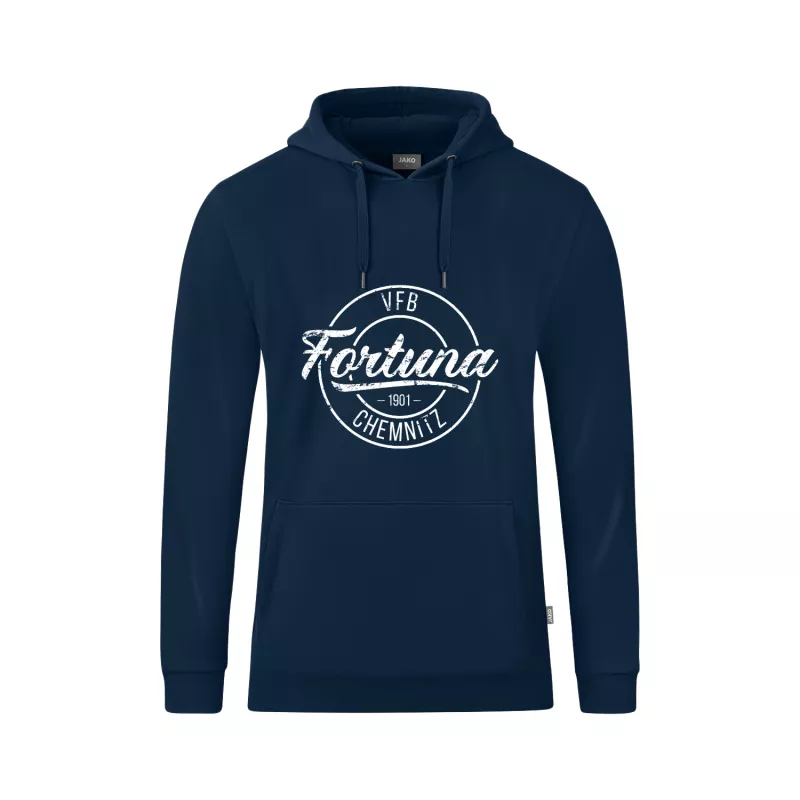 Nachhaltigkeit trifft Vereinsliebe – das Fortuna Kapuzensweat in Marine ist das perfekte Kleidungsstück für alle Fans des VfB Fortuna Chemnitz, die Wert auf Qualität, Komfort und Umweltbewusstsein legen. Gefertigt aus ringgesponnener Bio-Baumwolle (70 %) und recyceltem Polyester (30 %) überzeugt der Hoodie durch eine angenehm weiche, angeraute Innenseite und hervorragende Formstabilität. Die verstärkten Schulternähte und die Rippbündchen an Ärmeln und Saum sorgen für eine optimale Passform und Langlebigkeit – auch bei häufigem Tragen und Waschen. Das Kapuzensweat ist bei 40 °C waschbar, einlaufvorbehandelt und behält dank hochwertiger Farbstoffe seine Farbechtheit über lange Zeit. Praktische Kängurutaschen, eine Kapuze mit Single-Jersey-Innenseite und das dezente JAKO-Flaglabel an der linken Seitennaht runden das Design ab. Veredelt mit einem stilvollen Motiv des VfB Fortuna Chemnitz wird dieses Sweatshirt zum Ausdruck echten Teamgeists – perfekt für Training, Spieltage oder gemütliche Stunden im Alltag.